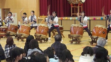 12月13日土曜日の午後、PTA主催の「まちだっこ音楽会」が体育館で開かれました。今回は相洋太鼓をお招きして中高生の迫力ある演奏で盛り上がりました。途中太鼓をたたかせてくれるコーナーもありました。演奏が終わった後は支援級のお店「ワクワクコースター屋さん」や毎年恒例のドローン体験で楽しみました。