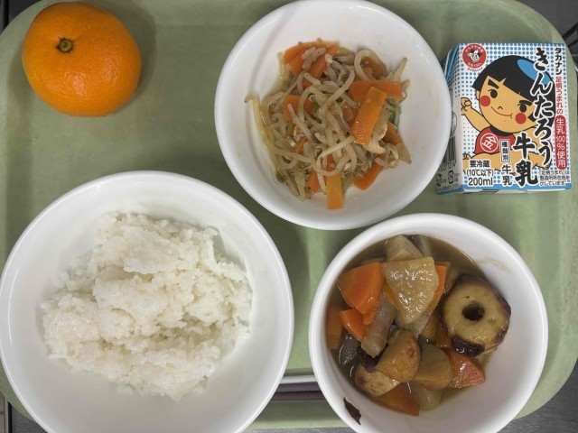 今日の献立は、牛乳 おだわらっこおでん もやしと小松菜のごま炒め みかん です。