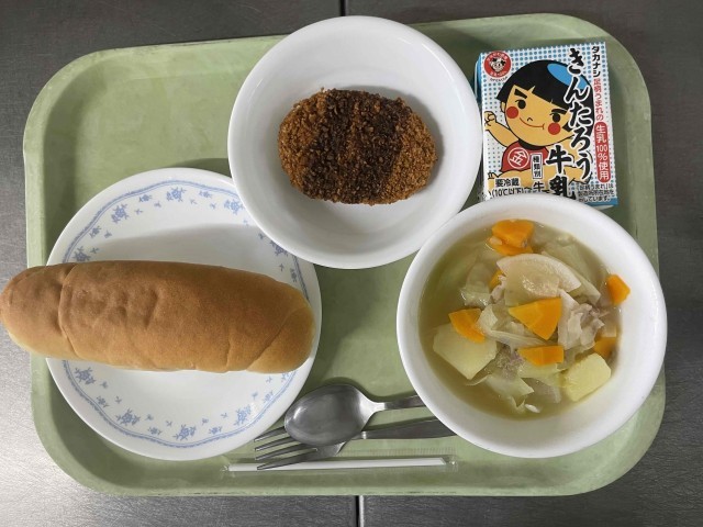 今日の献立は、牛乳 コッペパン メンチカツ 野菜のスープ煮です。