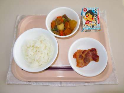 今日のメニューは、牛乳、ご飯、豚肉の西京焼き、野菜の含め煮でした。豚肉は、厚みがあり、みそ味がご飯をそそりました。含め煮には、サツマアゲ、ニンジン、ジャガイモなどが入っていて、味がよくしみていました。