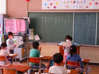 1年生の国語の授業です。クラスのお友達に、楽しいと思っていることをインタビューして、文章にまとめたことを発表しています。話し方、聞き方についても学んでいます。
