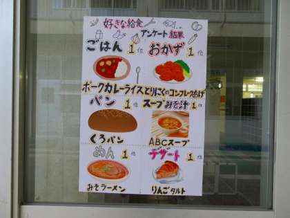 今週は、給食週間です。給食委員会が昼の放送で、アンケート結果を発表したり、食べ物の読み方クイズを出したりしていました。アンケート結果によると、ごはん部門の第1位は、ポークカレーライスでした。おかず部門の第1位は、鶏肉のコーンフレーク揚げでした。皆さんの好きな給食は?