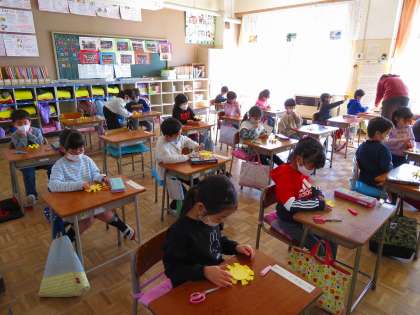 1年生が4月に入学してくる新1年生のために、花や輪飾りを作っています。みんな楽しみながら取り組んでいます。教室や廊下などに飾る予定ですが、1年生の思いが届くといいですね。
