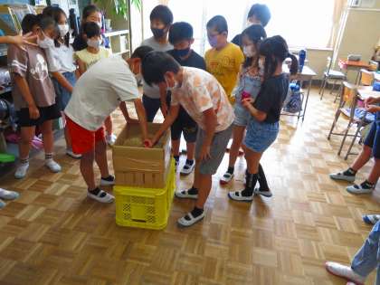 4年生が社会科の学習のつながりで、ダンボールコンポストを使って肥料づくりにチャレンジしています。子どもたちが野菜くずを持ち寄り、微生物がいる木くずや米ぬかの中に入れています。発酵するので、40度ほどの温かさがありました。今日は、その取材がありました。