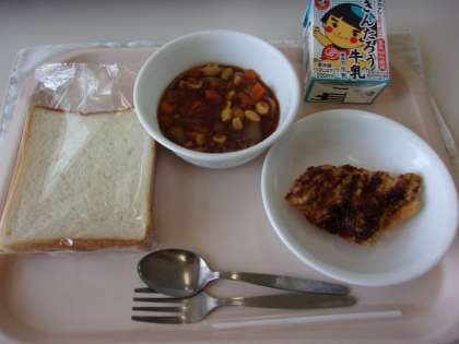今日の給食は、牛乳・食パン・チキンカツ・チリコンカンでした。チリコンカンは、メキシコ料理が由来とされる、アメリカ南部テキサス州の郷土料理です。