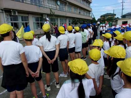 スポーツ大会まであと3日。全校の子どもたちが集まって、開閉会式等の練習をしました。そして、スポーツ大会のキャラクター「ペンタくん」がお披露目されました。
