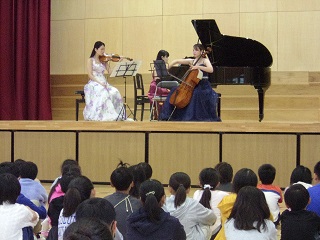 市のアウトリーチ事業で、ピアノトリオの音楽鑑賞会が行われました。全学年を2つに分けた2回公演で、ピアノやバイオリン、チェロの音色を聴いたり、校歌を弾いてもらったり、一緒に歌ったり踊ったりしました。本物を聴ける時間があっという間に過ぎていきました。