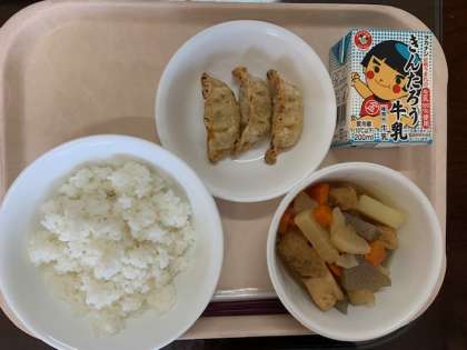 今日の給食は、牛乳・ご飯・関東煮・揚げぎょうざです。関東煮は鰹節でだしを取り、にんじんやこんにゃく、だいこん、じゃがいも、たこ天などを煮ています。ぎょうざはこめサラダ油で揚げています。こめサラダ油は、遺伝子組み換えの心配がない安全・安心の油です。軽くてさらっとしており、胃もたれもしません。