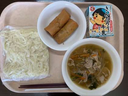 今日の給食は、牛乳・味噌ラーメン・揚げ春巻きです。ラーメンには、豚肉やにんじん、もやし、小松菜、葉ねぎなど、たくさんの具が入っています。春巻きは、こめサラダ油で揚げています。皮がぱりぱりしていておいしかったです。