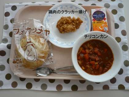 今日の給食はみかんジュース、フォカッチャ、チリコンカン、鶏肉のクラッカー揚げです。今日は土曜日ですが、保護者学級のため給食があります。