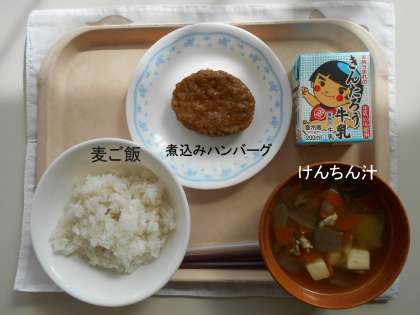 今日の給食は牛乳、麦ご飯、煮込みハンバーグ、けんちん汁です。