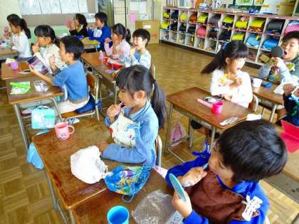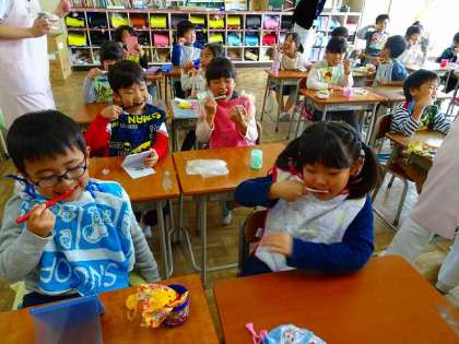 子どもたちは、紙芝居を見たり、歯の模型で磨き方を教えてもらい、実際に磨いたりしました。大きな口を開けて一生懸命歯磨きをする子どもたち、かわいかったです。