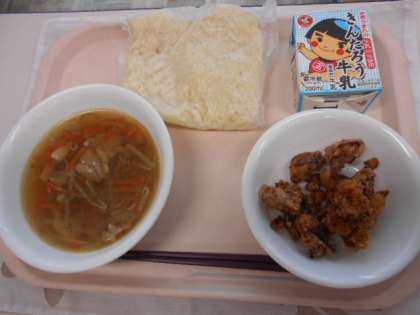 しょうゆラーメン とりのからあげ 牛乳・・・今日は、子どもたちの大好物メニューでした。しょうゆラーメンととりのからあげです。冬真っ盛りですが、パワーがつく献立がうれしいですね。