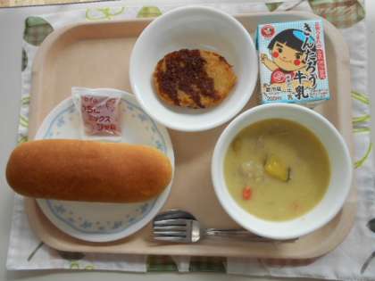 コッペパン いちごジャム かながわけんさんやさいコロッケ クリームスープ 牛乳・・・今日のコロッケには、神奈川県産の野菜が入っていました。クリームスープと一緒に、おいしくいただきました。