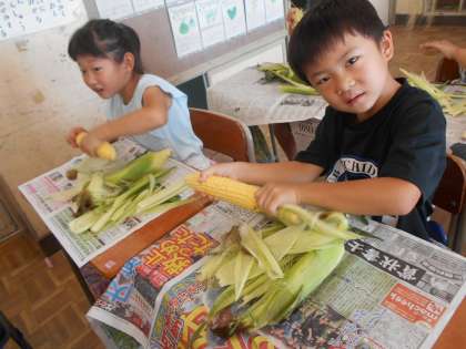 今日は、2年生が、とうもろこしの皮むき体験をしました。