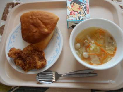 その1日目として、今日は、子どもたちの大好きなチキンカツバーガーとABCスープでした。おいしい給食を食べて元気もりもり!がんばりましょう!