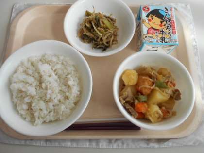 むぎごはん にくじゃが おかかいため 牛乳・・・今日は、和風メニューでした。にくじゃががじゃがいもと肉を中心に、野菜がたっぷりで、栄養満点でした。