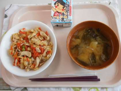 ごもくごはん じゃがいものみそしる 牛乳・・・今日は、甘めの味がついたごもくごはんがとてもおいしかったです。じゃがいものみそしるとよく合っていました。