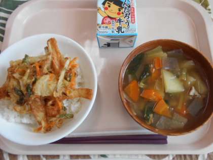 かきあげどん のっぺいじる 牛乳・・・今日もかみかみメニューでした。ごはんに大きなかき揚げがのせてありとてもおいしかったです。このかき揚げは、調理員さんが、1人分ずつ揚げてくれたものです。とても難しく、大変ですが、子どもたちのために一生懸命作ってくれました。ごちそうさまでした。