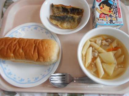げんまいパン あじのカレーふうみあげ ペンネスープ 牛乳・・・今日は、魚のメニューでした。鯵は、「味がよい」ということから、この名がついたそうです。本校では、子どもたちが食べやすいようにカレー味をつけて揚げています。ペンネスープとともに、おいしくいただきました。