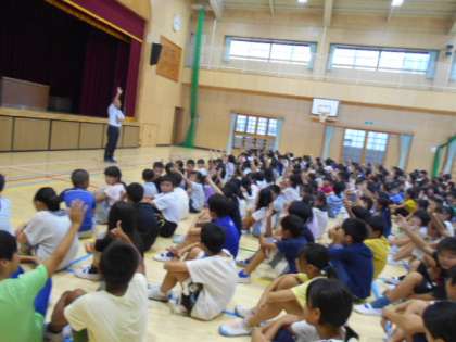 防災や熱中症についての話の後、最後に、表彰がありました。ミニバスの子どもたちです。男子も女子も夏休み中の大会で素晴らしい成績を収めました。大きな拍手が送られました。