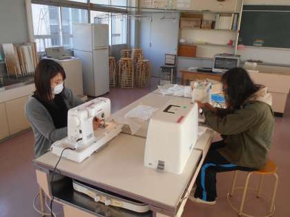 1枚目の写真は、机やいすを消毒したときに使う雑巾を縫っている様子です。