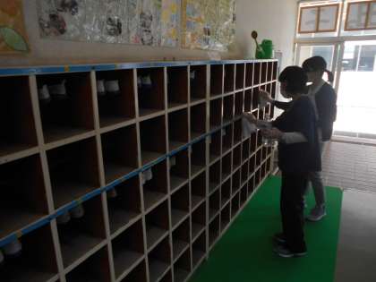 12日の分散登校が終わった後は、先生たちで各教室や階段、下駄箱などの消毒作業を行ったり分散登校時の様子について話し合ったりしました。また、分散登校の時は、各昇降口で「体温を測ってきた?」「教室に入るまえに手洗いしてね」と子どもたちに声をかけました。