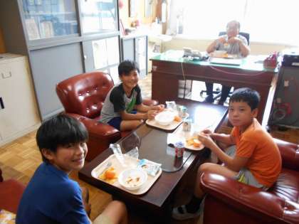 今日のメニューは、牛乳、ぶどうパン、ポテトのチリソース和え、小田原産冷凍ミカン。暑い日に食べる甘いぶどうパンが、牛乳にとてもあいます。また、ジャガイモ、サトイモ、サツマイモによる「おいも3兄弟」のチリソース和えも辛みがあり、最後に食べた冷凍ミカンがさらにおいしく感じました。6年生もおいしかったと言っていました。