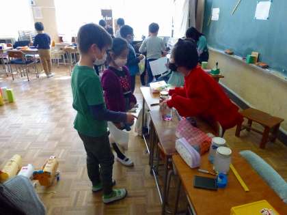 2年生が自分たちで作ったおもちゃ(ゲーム)のお店を開き、1年生を招待しました。「ストローアーチェリー」「びゅんびゅんかー」「ころりん」「ひっくりかえる」など、来た人が楽しめるような遊びをいろいろ考えたり、ルールを決めたりしていました。また、1年生には、カードにハンコを押して渡したり、景品をあげたりしてました。どちらも楽しく充実した時間になったようです。