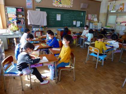 1年生の図工の時間です。二人組になって、お友達の顔を見ながら、絵を描いています。鼻から描き始め、そのあと、目、口など、周りを描いていきます。似ているように描けたかな?