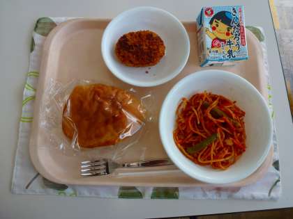 今日のメニューは、牛乳、国産豚肉コロッケサンドパン、トマトスパゲティでした。コロッケパンは、国産豚肉プラス、衣がサクサクで、ジャガイモもふっくらとしていておいしかったです。スパゲティもトマト味でおいしかったです。