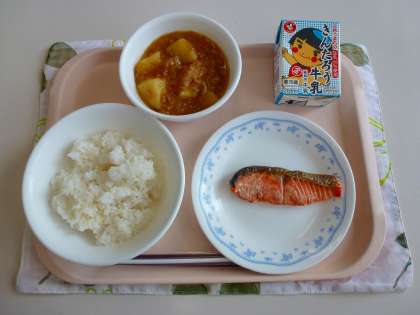 今日のメニューは、牛乳、ごはん、サケの塩焼き、ジャガイモのそぼろ煮でした。今日は、お肉とお魚。サケをほぐしてからご飯にのせてもいいし、そぼろ煮をご飯にかけても合いました。どっちもメインで、おいしさ2倍です。