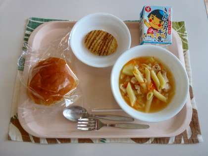 今日のメニューは、牛乳、メンチカツサンドパン、ペンネスープでした。メンチは、しっかり身が詰まっていておいしかったです。スープもペンネやジャガイモなどが柔らかくて、食べやすかったです。