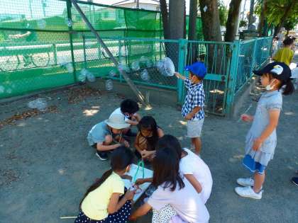 1年生がシャボン玉遊びをしています。自分たちで作った道具を使って、小さいシャボン玉や大きいシャボン玉作りに挑戦です。始めはなかなかうまくいきませんでしたが、こつをつかむと、どんどんできて、風に乗って飛んでいきました。