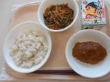 むぎごはん にこみハンバーグ こまつないりきんぴら 牛乳・・・今日は、きんぴら...