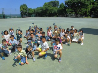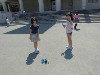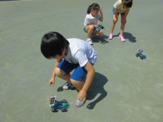 そこで、光電池の実験のチャンス!とグラウンドに出て、光電池を使った車を走らせてみました。