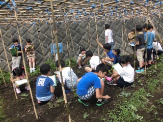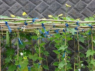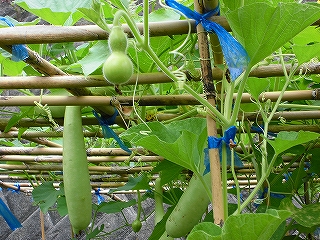 畑のひょうたんが、ぐんぐん育っています。地域にお住まいで畑ボランティアの松岡さんに作って頂いた棚いっぱいに伸びて見事に実っています。