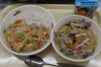 今日の給食は、『ゆば丼、豚汁、牛乳』でした。なぜ、ゆば丼?小田原市と姉妹都市の日光市は日光湯波で有名です。今日は、日光市姉妹都市メニューでゆば丼でした。笑顔で美味しくいただきました。