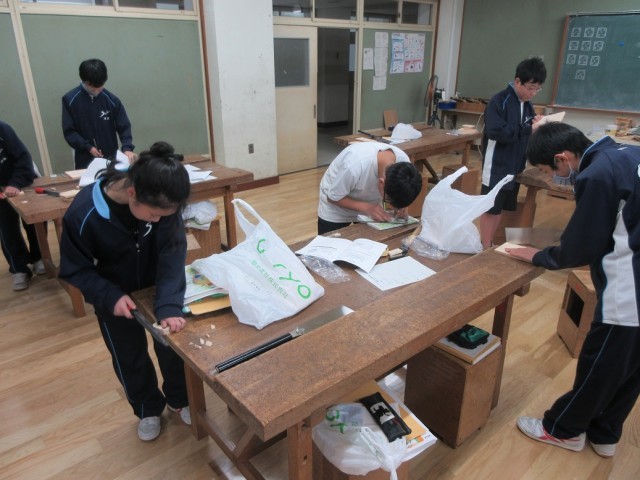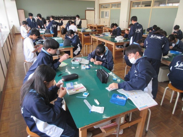 家庭科では、ティッシュケースをひと針ひと針丁寧に縫っています。
