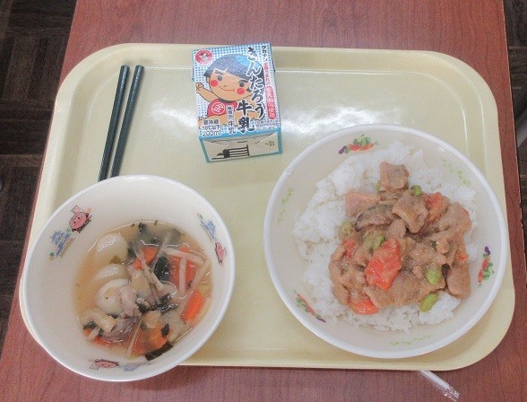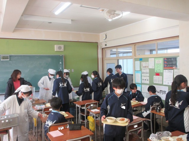 久々の給食、山盛りご飯で笑顔で食べている人が多くいました。