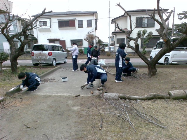 体育館横の梅や桜の木の剪定後の枝の片付け。