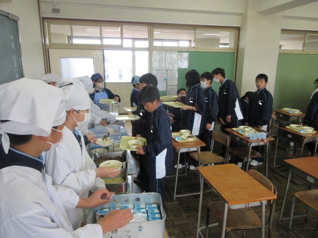 1年生にとって、中学校での給食は3日目となりました。保護者の配膳ボランティアの方の力を借りて、スムーズにいただきますができています。