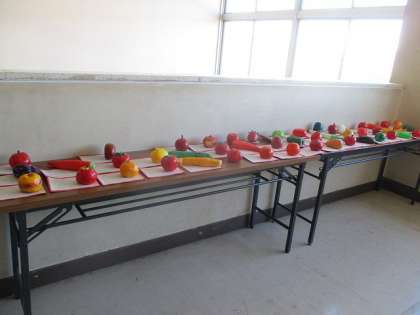 1年生は、野菜と果物を表現した作品です。見た目も美しく、みんなどれも美味しそうに見えます。1年生の力作です。