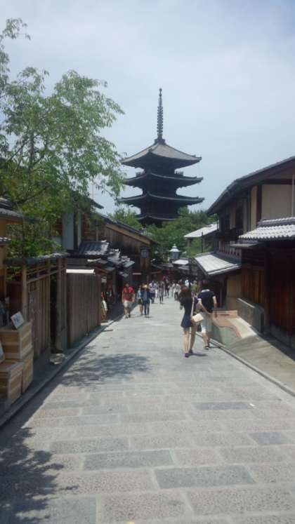 二年坂から見える八坂の塔は、いつ見ても風情があります。東山のシンボルです。今日は週末でしたので、観光客で賑やかです。体感温度は、30度を越す真夏日です。