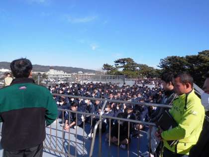 警戒音と共に訓練放送が入り、活動場所で身の安全の確保、揺れがおさまり安全確認後の校舎4階への移動、大津波警報発令による屋上への移動。