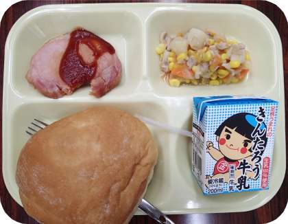 今日のメニューは、グリルハムバーガー(コッペパン)、野菜ソテー、牛乳です。689kcal。ハムの食感が絶妙で、とっても美味しかったです。