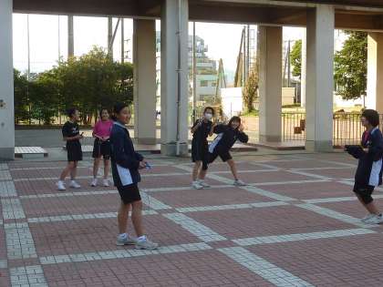 女子バドミントン部です。素振りが終わって縄跳びを使ったトレーニング中でした。私も二重跳びに挑戦しました。結果は。