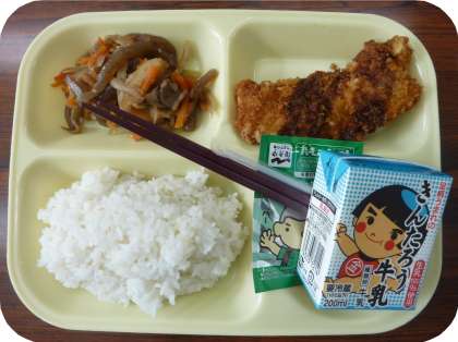 今日のメニューは、いかのフライ、きんぴらごぼう、麦ごはん、のりふりかけ、牛乳です。783kcal。今日は節分ですね。豆まきはするのでしょうか。恵方巻きかな。