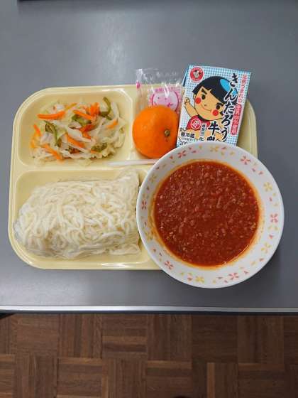 本日は牛乳、ソフト麺ミートソース、温野菜サラダ、イタリアンドレッシング、冷凍みかんです。今日も感謝の気持ちをもって美味しくいただきました。