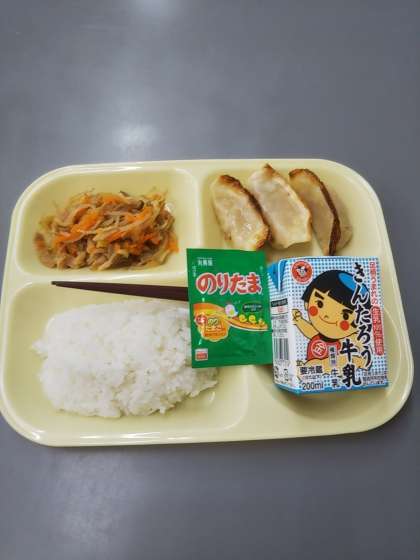 今日のメニューは、餃子、もやしのピリ辛炒め、のりたまふりかけ、ご飯、牛乳です。759kcal。